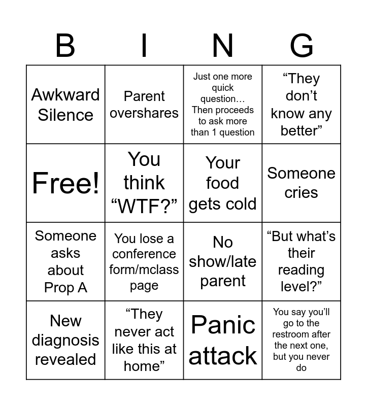 This bingo card has 16 words: “They never act like this at home”, “But what’s their reading level?”, Just one more quick question… Then proceeds to ask more than 1 question, Awkward Silence, Someone asks about Prop A, Parent overshares, No show/late parent, Panic attack, Free!, You think “WTF?”, New diagnosis revealed, “They don’t know any better”, You lose a conference form/mclass page, Someone cries, Your food gets cold and You say you’ll go to the restroom after the next one, but you never do.