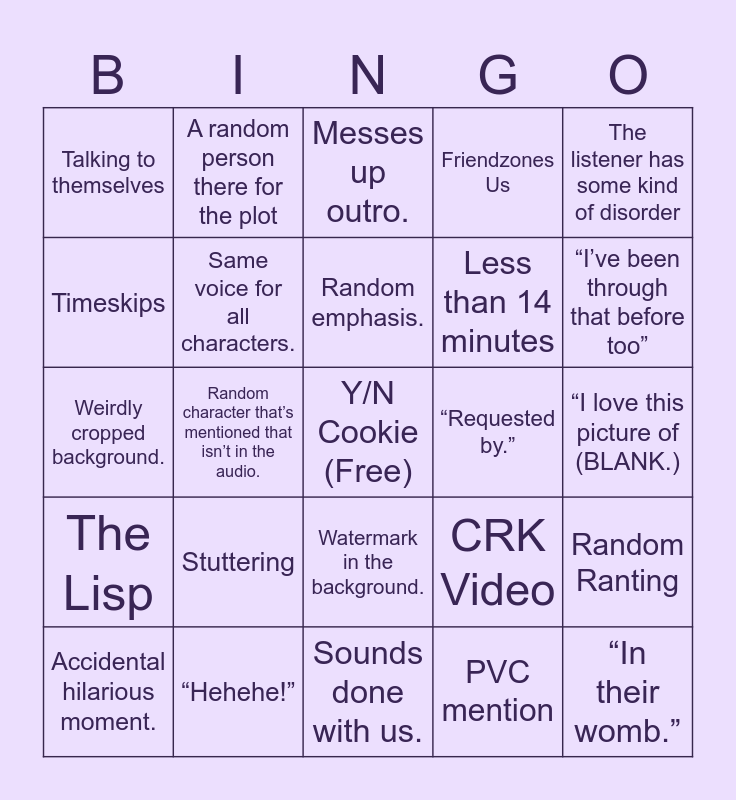 This bingo card has a free space and 24 words: Stuttering, “Hehehe!”, Random emphasis., Accidental hilarious moment., The listener has some kind of disorder, Talking to themselves, Timeskips, A random person there for the plot, “Requested by.”, Watermark in the background., Less than 14 minutes, Weirdly cropped background., CRK Video, Random Ranting, Same voice for all characters., PVC mention, “I love this picture of (BLANK.), Messes up outro., “I’ve been through that before too”, Random character that’s mentioned that isn’t in the audio., “In their womb.”, The Lisp, Friendzones Us and Sounds done with us..