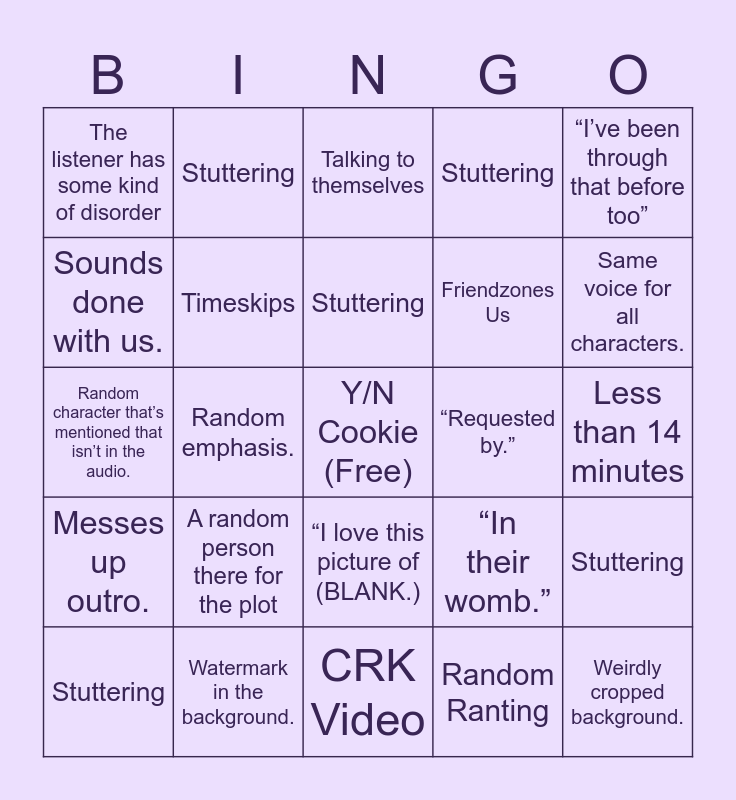 This bingo card has a free space and 29 words: Stuttering, “Hehehe!”, Random emphasis., Accidental hilarious moment., The listener has some kind of disorder, Talking to themselves, Timeskips, A random person there for the plot, “Requested by.”, Watermark in the background., Less than 14 minutes, Weirdly cropped background., CRK Video, Random Ranting, Same voice for all characters., PVC mention, “I love this picture of (BLANK.), Messes up outro., “I’ve been through that before too”, Random character that’s mentioned that isn’t in the audio., “In their womb.”, The Lisp, Friendzones Us, Sounds done with us., Stuttering, Stuttering, Stuttering, Stuttering and Stuttering.