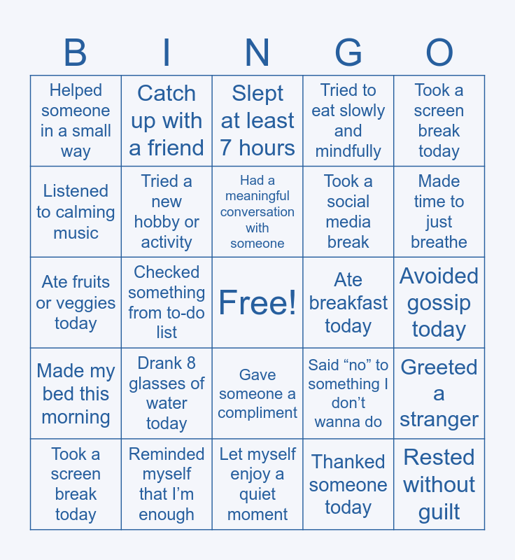 This bingo card has a free space and 24 words: Drank 8 glasses of water today, Reminded myself that I’m enough, Had a meaningful conversation with someone, Took a screen break today, Took a screen break today, Helped someone in a small way, Listened to calming music, Catch up with a friend, Ate breakfast today, Gave someone a compliment, Took a social media break, Ate fruits or veggies today, Said “no” to something I don’t wanna do, Greeted a stranger, Tried a new hobby or activity, Thanked someone today, Avoided gossip today, Slept at least 7 hours, Made time to just breathe, Checked something from to-do list, Rested without guilt, Made my bed this morning, Tried to eat slowly and mindfully and Let myself enjoy a quiet moment.