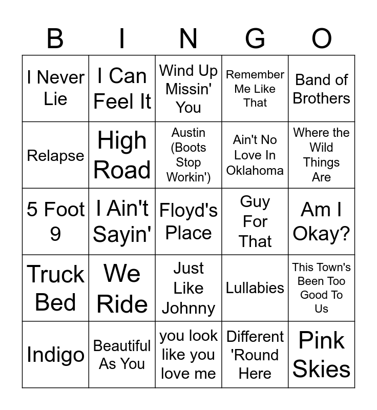 This bingo card has a free space and 74 words: What I Want, Bloodline, Austin (Boots Stop Workin'), A Bar Song (Tipsy), Liar, Miles On It, Company, I Had Some Help, Lonely Road, All Alone (My Ball), Indigo, My You, Ain't No Love In Oklahoma, Band of Brothers, World on Fire, Beautiful As You, Love Somebody, Guy For That, Anytime Anywhere, I Never Lie, I Ain't Sayin', Wind Up Missin' You, Remember Me Like That, Am I Okay?, Relapse, Hatteras Sand, I'm The Problem, What He'll Never Have, Young Love & Saturday Nights, Oops (I Think I Love You), High Road, Denim Eyed Dear, Worst Way, Fast Car, Last Night, The Guy That Left You, Heartbreaker, Pony Express, Pink Skies, ghost in my guitar, Mama's Prayer, Just Like Johnny, Pour Me A Drink, When The Lights Go Down, Now it's A Party, I Can Feel It, Texas Hold 'Em, Bentleys & Birkins, Goodbye Back, Memory Lane, Mamaw's House, Bulletproof, Lullabies, Need A Favor, Religiously, The Painter, you look like you love me, Karma's Kiss, Heartbroken, Truck Bed, We Ride, White Horse, Different 'Round Here, This Town's Been Too Good To Us, 5 Foot 9, I Remember Everything, Rock and A Hard Place, Something's Gonna Kill Me, Where the Wild Things Are, Next Thing You Know, Outskirts, goodbye looks good on you, I'm Not Pretty and Country Boy's Dream Girl.