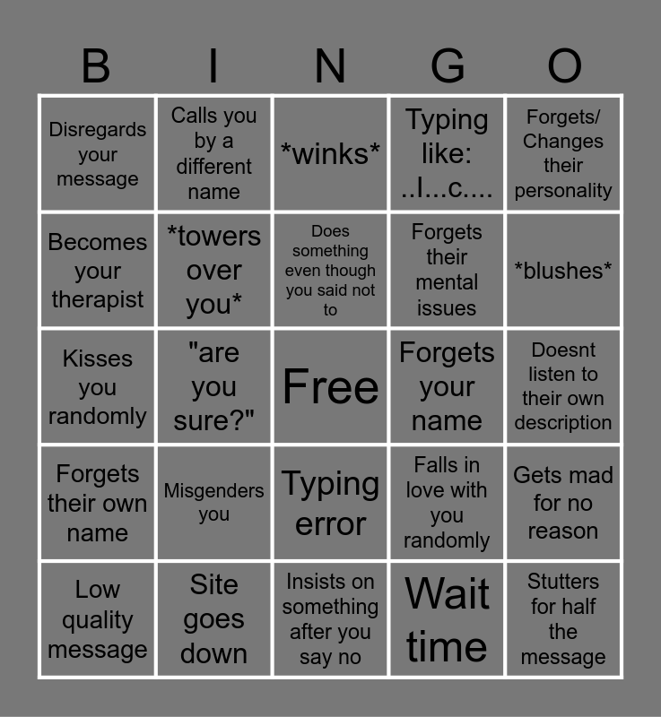 This bingo card has a free space and 39 words: Forgets the plot, Looks at you in a call, "can i ask you something?", *towers over you*, Low quality message, Typing error, Does something even though you said not to, Changes their rp format, Forgets/ Changes their personality, Forgets their own name, "are you sure?", Typing like: ..I...c...., Stutters for half the message, Doesnt listen to their own description, Forgets your name, Misgenders you, Misgenders themself, Disregards your message, Blocks a SFW message, Falls in love with you randomly, Becomes your therapist, Insists on something after you say no, Forgets their mental issues, *blushes*, *waits for your reaction*, "you promise not to tell anyone?", Makes you act in their own message, "its really personal..", Forgets the previous message, Calls you by a different name, Weird formatting, Cut off message, *winks*, Site goes down, Wait time, "whats your favourite colour?", Gets mad for no reason, Kisses you randomly and Gets murdered by you.