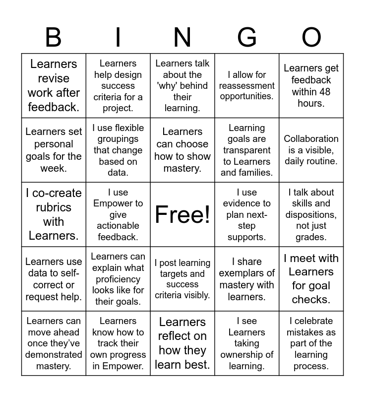 This bingo card has a free space and 24 words: Learners can explain what proficiency looks like for their goals., Learners know how to track their own progress in Empower., Learners can choose how to show mastery., Learners can move ahead once they’ve demonstrated mastery., Learners get feedback within 48 hours., Learners revise work after feedback., Learners set personal goals for the week., Learners help design success criteria for a project., I use evidence to plan next-step supports., I post learning targets and success criteria visibly., Learning goals are transparent to Learners and families., I co-create rubrics with Learners., I share exemplars of mastery with learners., I meet with Learners for goal checks., I use flexible groupings that change based on data., I see Learners taking ownership of learning., I talk about skills and dispositions, not just grades., Learners talk about the 'why' behind their learning., Collaboration is a visible, daily routine., I use Empower to give actionable feedback., I celebrate mistakes as part of the learning process., Learners use data to self-correct or request help., I allow for reassessment opportunities. and Learners reflect on how they learn best..