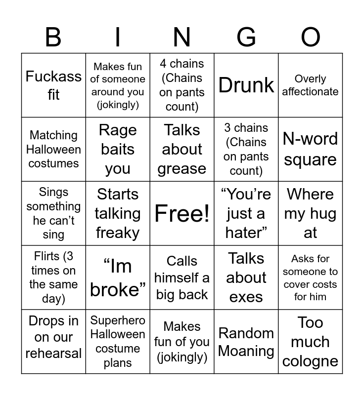 This bingo card has a free space and 39 words: starts belting in the wrong key, Hear him before you see him, Talks about crushes/hookups, Rage baits you, Drops in on our rehearsal, Calls himself a big back, Talks about grease, Starts being creepy, Overly affectionate, Flirts (3 times on the same day), Starts talking freaky, Drunk, Too much cologne, Where my hug at, “You’re just a hater”, “Im broke”, In the costume shop, Fuckass fit, Platinum chain, Talks about exes, Matching Halloween costumes, Makes fun of you (jokingly), 3 chains (Chains on pants count), N-word square, Gold chain, Talks about Young Frankenstein, Hear him in the blackbox from arena, With Connor James Halversen Ram, “In Columbia…”, Makes fun of someone around you (jokingly), Overconfident about auditions, “Is the fit hard”, 4 chains (Chains on pants count), Superhero Halloween costume plans, Random Moaning, “When I get a car…”, Asks for someone to cover costs for him, Sings something he can’t sing and Talks about basketball.