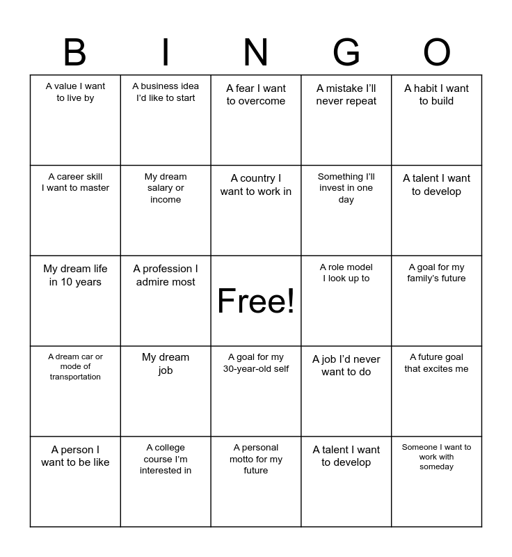 This bingo card has a free space and 24 words: My dream job, A college course I’m interested in, A country I want to work in, A person I want to be like, A habit I want to build, A value I want to live by, A career skill I want to master, A business idea I’d like to start, A role model I look up to, A goal for my 30-year-old self, Something I’ll invest in one day, My dream life in 10 years, A job I’d never want to do, A future goal that excites me, My dream salary or income, A talent I want to develop, A goal for my family’s future, A fear I want to overcome, A talent I want to develop, A profession I admire most, Someone I want to work with someday, A dream car or mode of transportation, A mistake I’ll never repeat and A personal motto for my future.