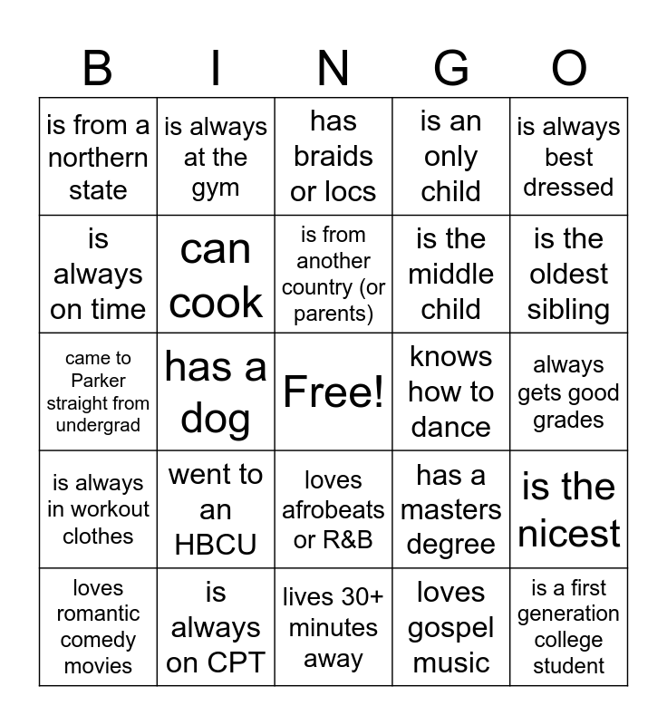 This bingo card has a free space and 29 words: loves romantic comedy movies, loves watching sports, has a dog, is from a southern state, is from a northern state, has braids or locs, can cook, went to an HBCU, knows how to dance, is always on CPT, always gets good grades, is a first generation college student, lives 30+ minutes away, loves gospel music, is the oldest sibling, is the youngest sibling, loves afrobeats or R&B, is always in workout clothes, is always best dressed, came to Parker straight from undergrad, has a masters degree, loves SABCA, is the middle child, is always on time, is an only child, is always at the gym, is the nicest, is from another country (or parents) and played 2+ sports growing up.