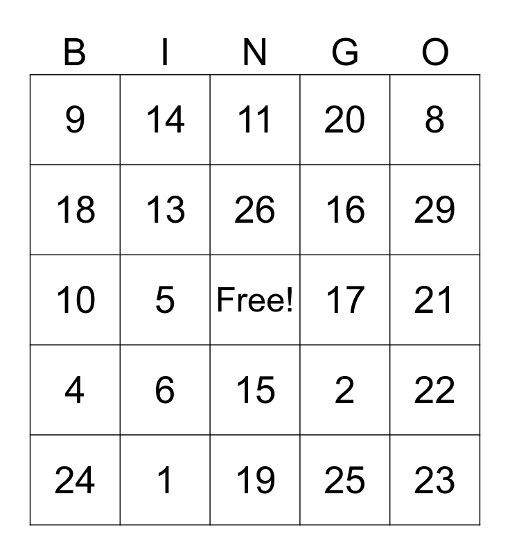 This bingo card has a free space and 30 words: 1, 3, 5, 7, 9, 11, 13, 15, 17, 19, 21, 23, 25, 27, 29, 30, 2, 4, 6, 8, 10, 12, 14, 16, 18, 20, 22, 24, 26 and 28.