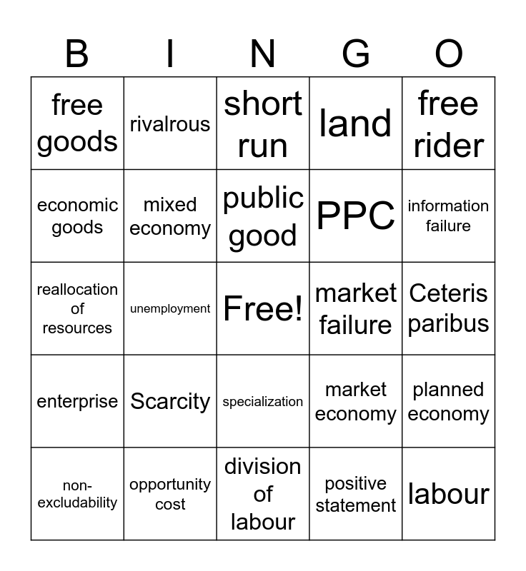 This bingo card has a free space and 24 words: Scarcity, opportunity cost, public good, non-excludability, free rider, free goods, economic goods, rivalrous, market failure, specialization, PPC, reallocation of resources, market economy, planned economy, mixed economy, positive statement, Ceteris paribus, short run, information failure, unemployment, labour, enterprise, land and division of labour.