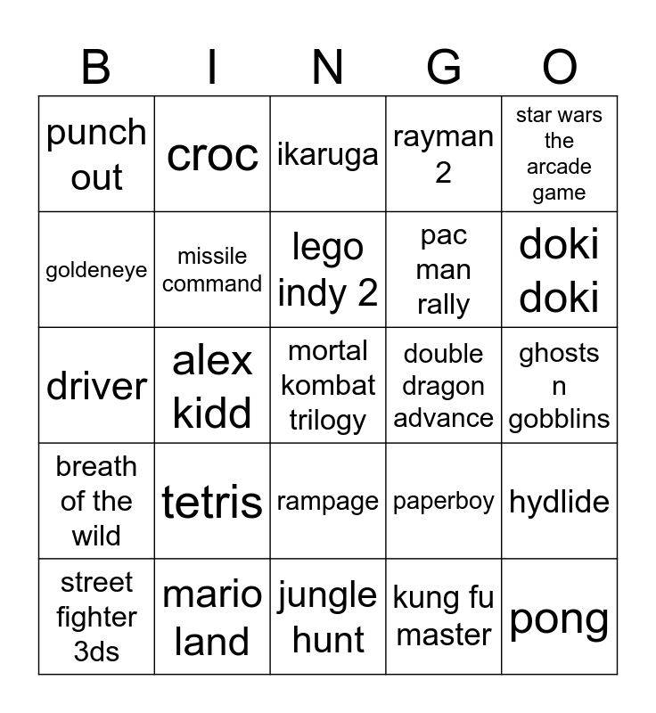 This bingo card has a free space and 24 words: tetris, mario land, lego indy 2, street fighter 3ds, star wars the arcade game, punch out, goldeneye, croc, double dragon advance, rampage, pac man rally, driver, paperboy, hydlide, missile command, kung fu master, ghosts n gobblins, ikaruga, doki doki, alex kidd, pong, breath of the wild, rayman 2 and jungle hunt.