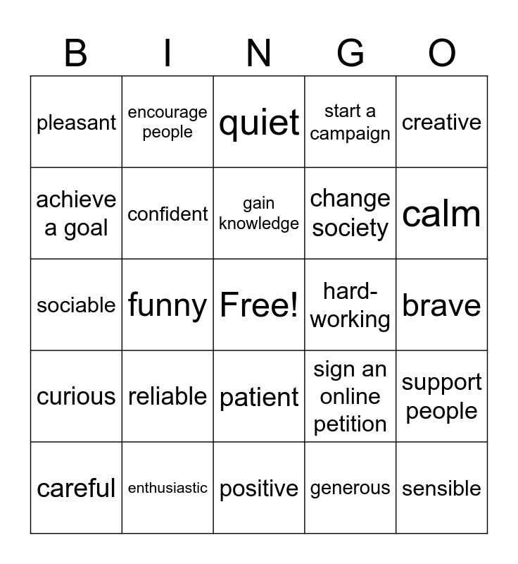 This bingo card has a free space and 29 words: careful, friendly, funny, kind, pleasant, quiet, confident, reliable, hard-working, enthusiastic, brave, sensible, positive, generous, calm, talented, patient, curious, creative, sociable, sign an online petition, make a difference, change society, achieve a goal, start a campaign, encourage people, support people, gain knowledge and win an award.