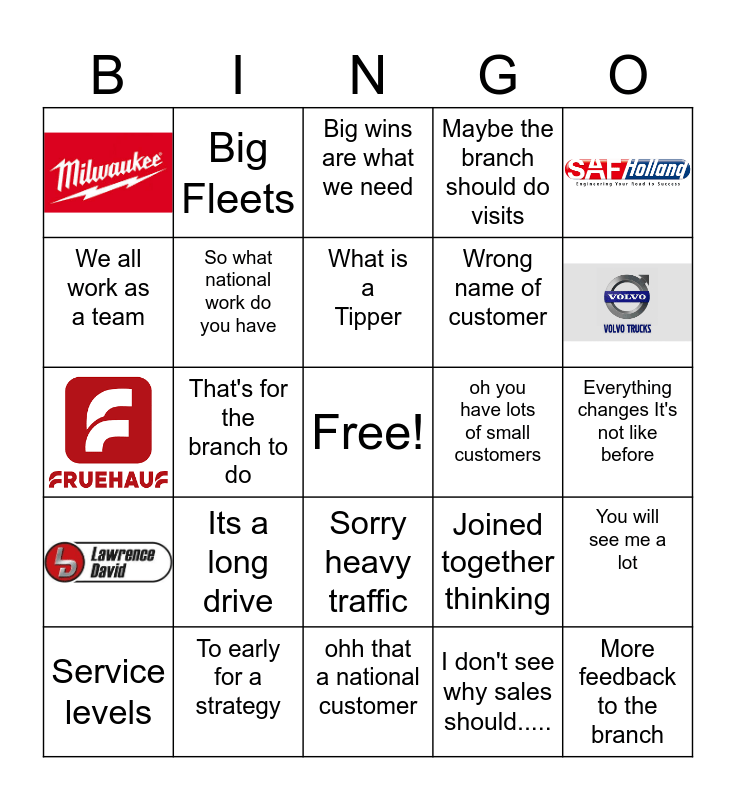 This bingo card has 5 images, a free space and 19 words: Its a long drive, To early for a strategy, What is a Tipper, Service levels, We all work as a team, Big Fleets, oh you have lots of small customers, Sorry heavy traffic, Wrong name of customer, Joined together thinking, You will see me a lot, So what national work do you have, I don't see why sales should....., Everything changes It's not like before, Big wins are what we need, That's for the branch to do, More feedback to the branch, Maybe the branch should do visits and ohh that a national customer.