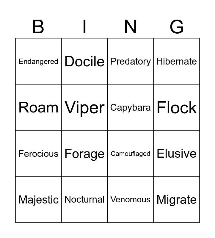 This bingo card has 16 words: Nocturnal, Elusive, Predatory, Endangered, Ferocious, Docile, Camouflaged, Venomous, Roam, Viper, Majestic, Hibernate, Forage, Flock, Capybara and Migrate.