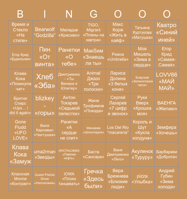 This bingo card has 50 words: Барбарики «Доброта», Моя Мишель «Зима в сердце», pizza «Улыбка», blizkey - «горы», Дмитриенко - «Ты Венера я Юпитер», Минаева «Шоколадка», Bearwolf “Godzilla”, Гречка «Здесь были», Татьяна Куртукова «Матушка», Los Del Rio “macarena”, Кватро «Синий иней», TIGO, Migrant «Планы на завтра», Боярский «Зеленоглазое такси», Лариса Долина «3 белых коня», ИНСТАСАМКА «Пампим нефть», ВАЕНГА «Желаю», Егор Крид «Будильник», Егор Крид «Самая- Самая», Классная Молли «Контракт», Макс Корж «Жить в кайф», Риана «Umbrella», Антон Токарев «Седьмой лепесток», Время и Стекло «На стиле», Пин «От винта», Quest Pistols Show «Непохожие», Женя Трофимов «Поезда», Ранетки «О тебе», IOWA «Плохо танцевать», Меладзе «Красиво», Animal Джазз «Три полоски», Markul, Тося Чайкина «Стрелы», Gone Fludd «UFO LOVE», uma2rman «Звезды», Баста «Сансара», Бритни Спирс «Ups… i did it again», Руки Вверх «Крошка моя», Король и Шут «Кукла колдуна», Земфира «Хочешь», Клава Кока «Замуж, Клава Кока «Покинула чат», Ранетки «А сердце не спит», Ваня Дмитриенко «Лего», Валя Карнавал «Частушка», Вера Брежнева «Близкие люди», LOVV66 «МАЙ МАЙ», МакSим «Знаешь ли ты», Сергей Лазарев «7 цифр и звонок», Акуленок «Туруру», Хлеб «Эба» and Андрей Губин «Зима холода».
