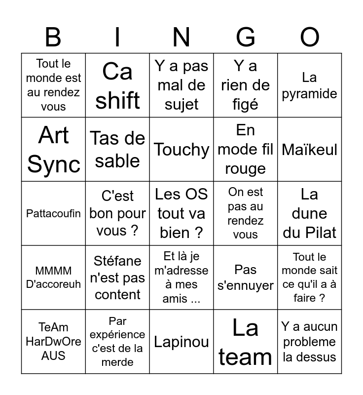 This bingo card has 25 words: Stéfane n'est pas content, Lapinou, Touchy, TeAm HarDwOre AUS, La pyramide, Tout le monde est au rendez vous, Art Sync, Ca shift, On est pas au rendez vous, Et là je m'adresse à mes amis ..., En mode fil rouge, Pattacoufin, Pas s'ennuyer, Tout le monde sait ce qu'il a à faire ?, Tas de sable, Y a aucun probleme la dessus, La dune du Pilat, Y a pas mal de sujet, Maïkeul, C'est bon pour vous ?, Les OS tout va bien ?, Par expérience c'est de la merde, MMMM D'accoreuh, Y a rien de figé and La team.
