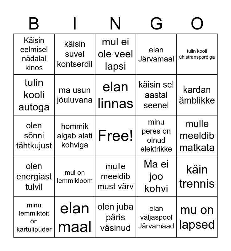 This bingo card has a free space and 24 words: mul on lemmikloom, elan maal, elan linnas, minu lemmiktoit on kartulipuder, tulin kooli ühistranspordiga, Käisin eelmisel nädalal kinos, tulin kooli autoga, käisin suvel kontserdil, minu peres on olnud elektrikke, mulle meeldib must värv, käisin sel aastal seenel, olen sõnni tähtkujust, Ma ei joo kohvi, käin trennis, ma usun jõuluvana, elan väljaspool Järvamaad, mulle meeldib matkata, mul ei ole veel lapsi, kardan ämblikke, hommik algab alati kohviga, mu on lapsed, olen energiast tulvil, elan Järvamaal and olen juba päris väsinud.