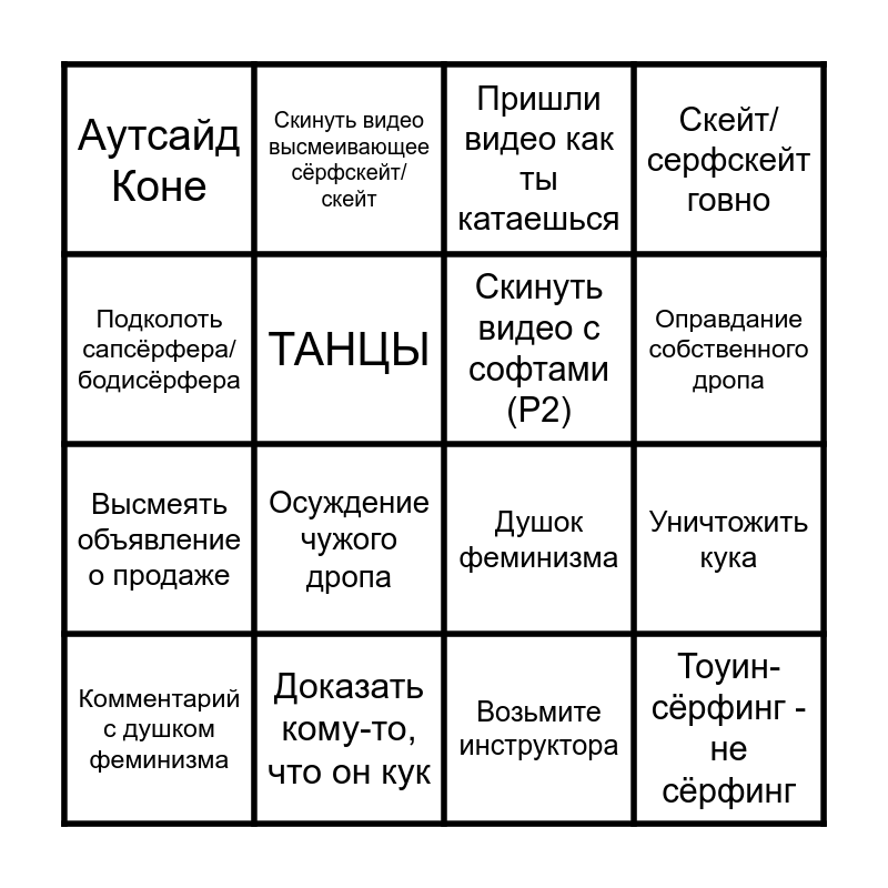 This bingo card has 16 words: Доказать кому-то, что он кук, Уничтожить кука, Пришли видео как ты катаешься, Аутсайд Коне, Высмеять объявление о продаже, Скинуть видео высмеивающее сёрфскейт/скейт, Душок феминизма, Возьмите инструктора, Подколоть сапсёрфера/бодисёрфера, ТАНЦЫ, Комментарий с душком феминизма, Скейт/серфскейт говно, Осуждение чужого дропа, Оправдание собственного дропа, Скинуть видео с софтами (P2) and Тоуин-сёрфинг - не сёрфинг.