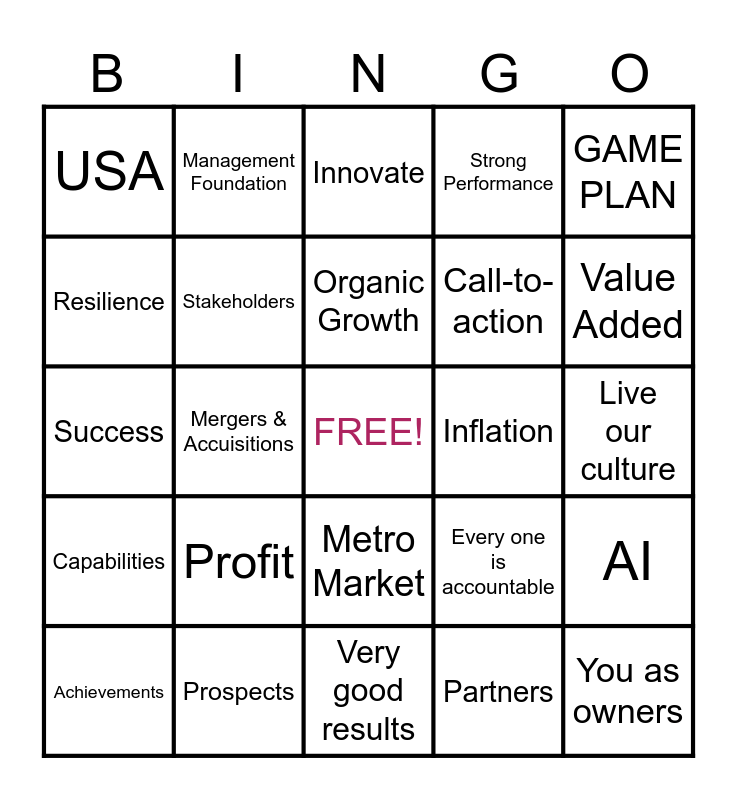 This bingo card has a free space and 28 words: AI, Launch our strategy, Call-to-action, Partners, Resilience, Innovate, Management Foundation, Capabilities, Inflation, Achievements, Success, Strong Performance, Prospects, Very good results, Value Added, Client Satisfaction, Profit, Stakeholders, Organic Growth, Metro Market, USA, Tough decisions, You as owners, Mergers & Accuisitions, Live our culture, Every one is accountable, GAME PLAN and Strong culture.