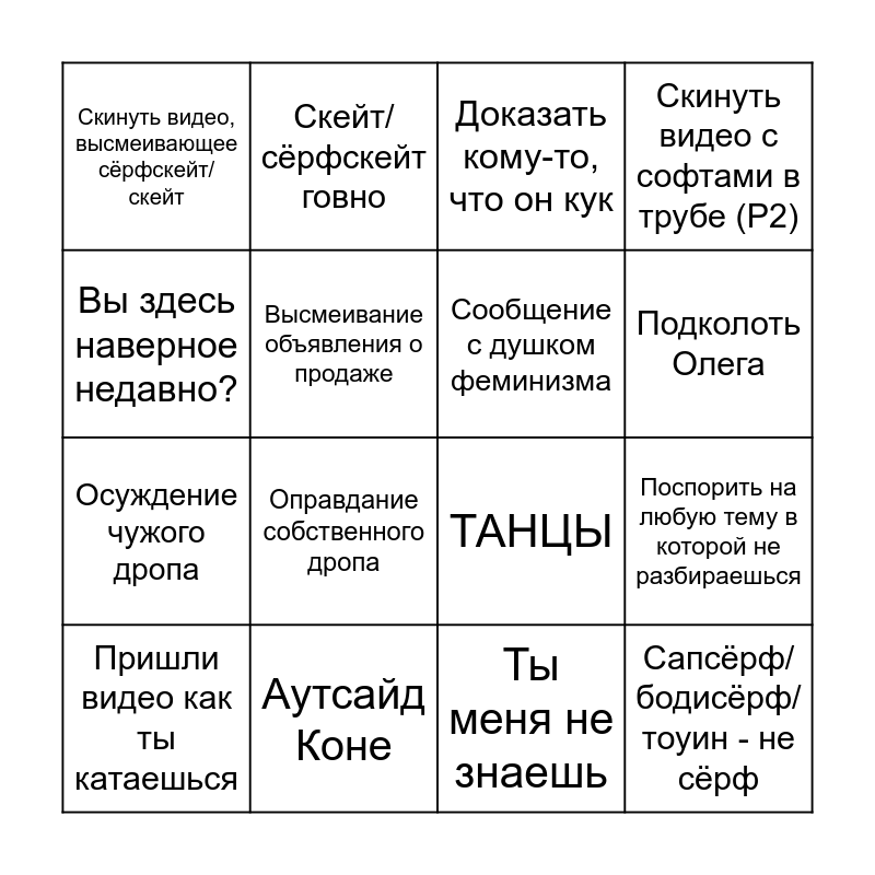 This bingo card has 16 words: Пришли видео как ты катаешься, Аутсайд Коне, Доказать кому-то, что он кук, Скинуть видео с софтами в трубе (P2), Вы здесь наверное недавно?, Скейт/сёрфскейт говно, ТАНЦЫ, Поспорить на любую тему в которой не разбираешься, Скинуть видео, высмеивающее сёрфскейт/скейт, Высмеивание объявления о продаже, Ты меня не знаешь, Подколоть Олега, Осуждение чужого дропа, Оправдание собственного дропа, Сообщение с душком феминизма and Сапсёрф/бодисёрф/тоуин - не сёрф.