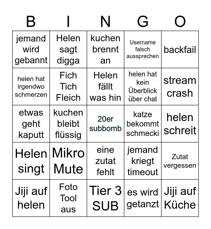 This bingo card has a free space and 24 words: Mikro Mute, Foto Tool aus, Helen fällt was hin, Jiji auf helen, backfail, jemand wird gebannt, helen hat irgendwo schmerzen, Helen sagt digga, katze bekommt schmecki, eine zutat fehlt, helen hat kein Überblick über chat, etwas geht kaputt, jemand kriegt timeout, Zutat vergessen, Fich Tich Fleich, es wird getanzt, helen schreit, kuchen brennt an, stream crash, kuchen bleibt flüssig, Jiji auf Küche, Helen singt, Username falsch aussprechen and Tier 3 SUB.