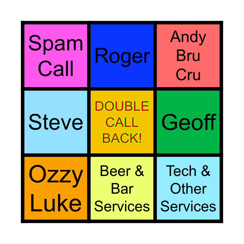 This bingo card has a free space and 8 words: Geoff, Andy Bru Cru, Roger, Ozzy Luke, Spam Call, Tech & Other Services, Steve and Beer & Bar Services.
