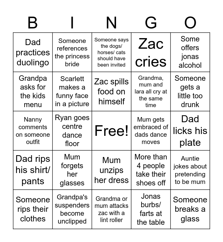 This bingo card has a free space and 24 words: Mum forgets her glasses, Grandpa's suspenders become unclipped, Zac spills food on himself, Someone rips their clothes, Some offers jonas alcohol, Dad practices duolingo, Grandpa asks for the kids menu, Someone references the princess bride, Mum gets embraced of dads dance moves, Mum unzips her dress, Grandma, mum and lara all cry at the same time, Nanny comments on someone outfit, More than 4 people take their shoes off, Auntie jokes about pretending to be mum, Scarlett makes a funny face in a picture, Jonas burbs/ farts at the table, Dad licks his plate, Someone says the dogs/ horses/ cats should have been invited, Someone gets a little too drunk, Ryan goes centre dance floor, Someone breaks a glass, Dad rips his shirt/ pants, Zac cries and Grandma or mum attacks zac with a lint roller.