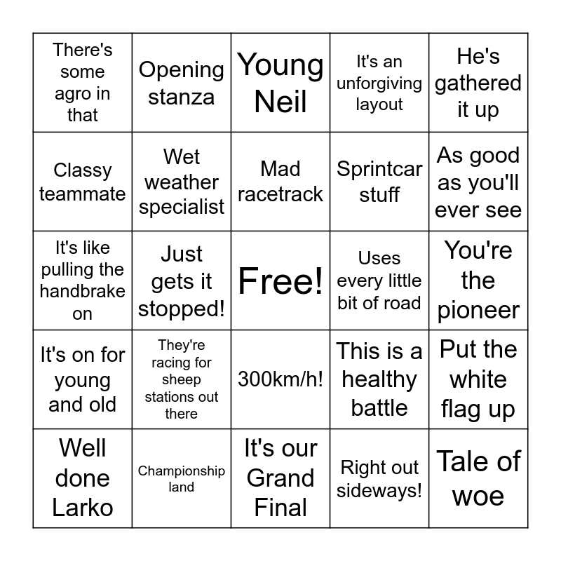 This bingo card has a free space and 35 words: Safety cars breed safety cars, Cold brakes, cold tyres, cold minds, These guys play for keeps, Wet weather specialist, 300km/h!, It's an unforgiving layout, Classy teammate, He's very animated, Mad racetrack, That's a bit ugly, It's like pulling the handbrake on, He's gathered it up, He's got great car control!, He's in the fence!, There's some agro in that, Uses every little bit of road, Right out sideways!, Just gets it stopped!, It's on for young and old, Tale of woe, This is a healthy battle, Well done Larko, Put the white flag up, Championship land, Young Neil, As good as you'll ever see, Risk versus reward, Out of control, Sprintcar stuff, You're the pioneer, Fastest straight in Australian Motorsport, It's our Grand Final, They're racing for sheep stations out there, Opening stanza and Cam and Chaz history mentioned.