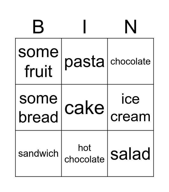 This bingo card has 19 words: pizza, orange juice, chocolate, tea, banana, cake, biscuits, some fruit, pasta, salad, lemonade, ice cream, sandwich, milk, tea, a snack, some bread, hot chocolate and some soup.