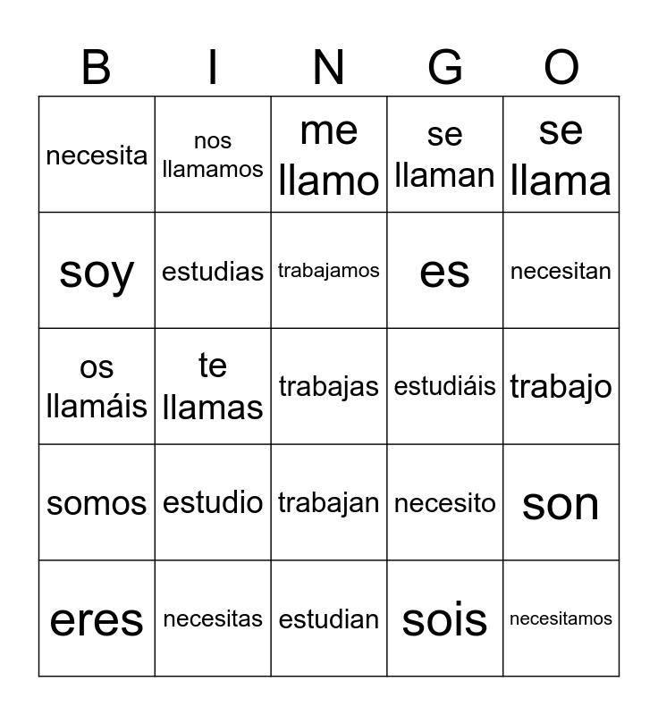 This bingo card has a free space and 24 words: estudio, necesitas, trabajamos, eres, se llama, necesita, soy, nos llamamos, estudiáis, trabajan, es, os llamáis, necesito, son, estudias, sois, trabajo, me llamo, necesitan, te llamas, necesitamos, somos, se llaman and estudian.