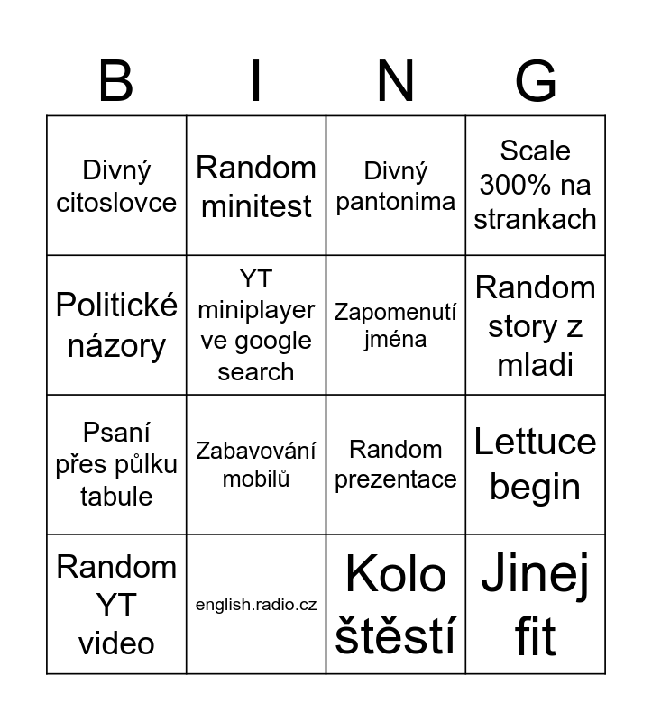 This bingo card has 16 words: english.radio.cz, Lettuce begin, Divný pantonima, Divný citoslovce, Psaní přes půlku tabule, Random minitest, Random prezentace, Kolo štěstí, Politické názory, YT miniplayer ve google search, Random YT video, Scale 300% na strankach, Zabavování mobilů, Random story z mladi, Zapomenutí jména and Jinej fit.