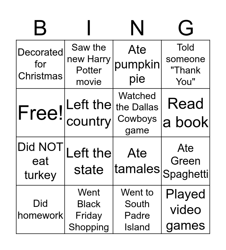 This bingo card has 16 words: Went Black Friday Shopping, Ate Green Spaghetti, Ate pumpkin pie, Decorated for Christmas, Did NOT eat turkey, Saw the new Harry Potter movie, Ate tamales, Went to South Padre Island, Free!, Left the country, Did homework, Told someone "Thank You", Left the state, Read a book, Watched the Dallas Cowboys game and Played video games.