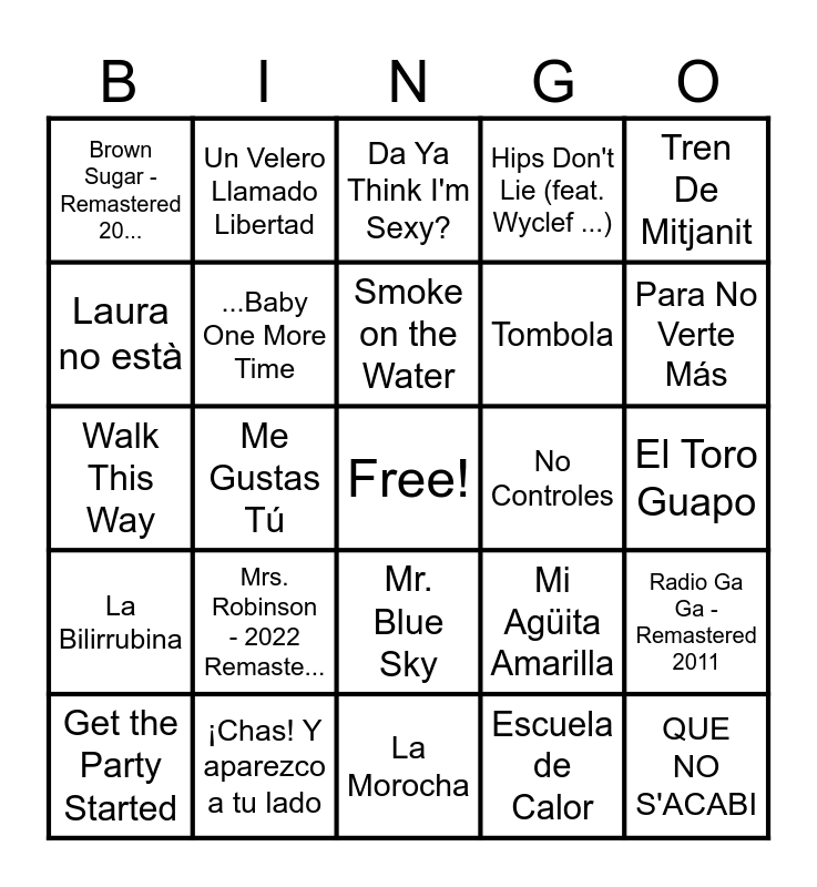 This bingo card has a free space and 36 words: Proud Mary, Me Duele La Cara De Ser Ta..., Veneno en la Piel, ...Baby One More Time, Mi Agüita Amarilla, La Bilirrubina, Smoke on the Water, La Lola, Tren De Mitjanit, I'll Be There for You - Theme Fr..., Me Gustas Tú, Hips Don't Lie (feat. Wyclef ...), Cosmic Girl - Remastered 2..., No Controles, Para No Verte Más, Brown Sugar - Remastered 20..., Yo Quiero Bailar, Mrs. Robinson - 2022 Remaste..., QUE NO S'ACABI, Da Ya Think I'm Sexy?, El Toro Guapo, Radio Ga Ga - Remastered 2011, ¡Chas! Y aparezco a tu lado, Get the Party Started, La Morocha, Un Velero Llamado Libertad, Walk This Way, El Fin del Mundo, Tombola, Laura no està, Caliente, caliente, Thunderstruck, Escuela de Calor, Mr. Blue Sky, A fuego lento and Always on My Mind.