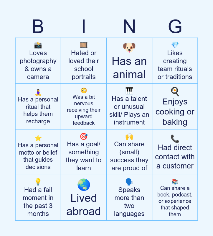 This bingo card has 16 words: 🌏 Lived abroad, 📞 Had direct contact with a customer, 🐶 Has an animal, 📸 Loves photography & owns a camera, ⭐️ Has a personal motto or belief that guides decisions, 🎞️ Hated or loved their school portraits, 🙌 Can share (small) success they are proud of, 🗣️ Speaks more than two languages, 🧘♀️ Has a personal ritual that helps them recharge, 😳 Was a bit nervous receiving their upward feedback, 💡 Had a fail moment in the past 3 months, 💎 Likes creating team rituals or traditions, 🎯 Has a goal/ something they want to learn, 🍳 Enjoys cooking or baking, 🎹 Has a talent or unusual skill/ Plays an instrument and 📚 Can share a book, podcast, or experience that shaped them.