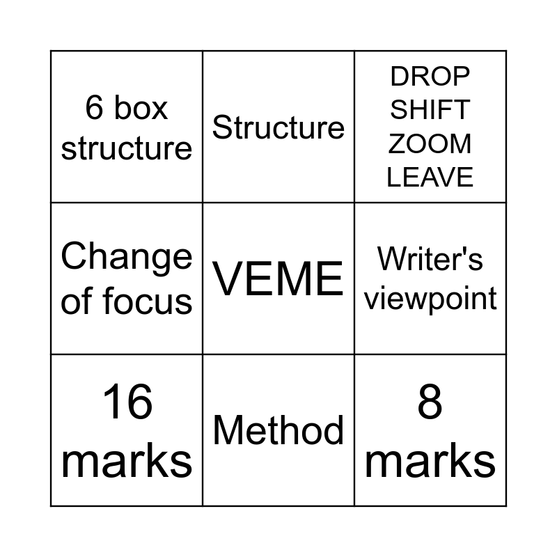 This bingo card has 12 words: Non fiction, 8 marks, VEME, Writer's viewpoint, Structure, DROP SHIFT ZOOM LEAVE, Method, AO5,6, 6 box structure, Change of focus, 16 marks and 20 marks.