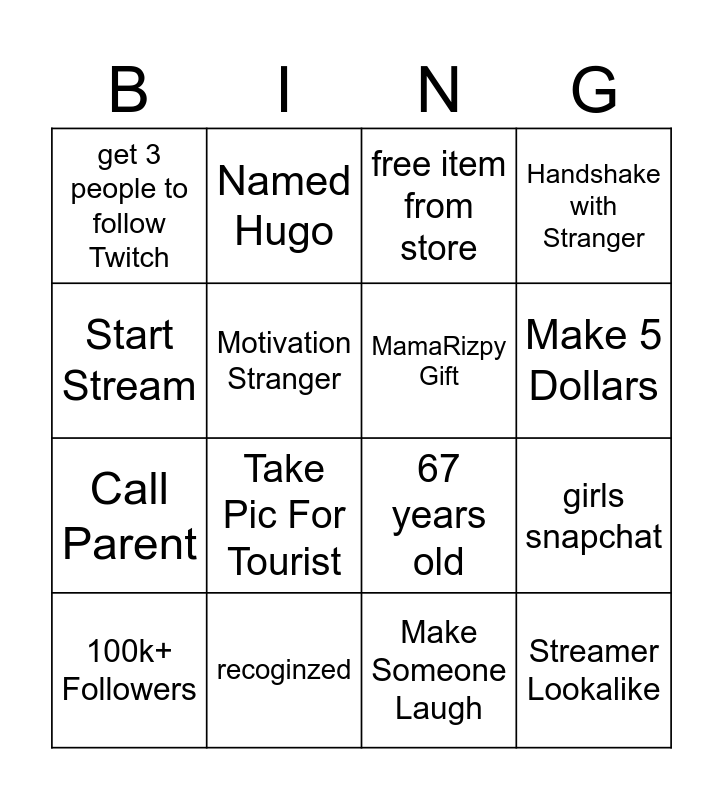 This bingo card has 16 words: recoginzed, girls snapchat, free item from store, get 3 people to follow Twitch, Call Parent, Named Hugo, 67 years old, Make Someone Laugh, Start Stream, Motivation Stranger, 100k+ Followers, Handshake with Stranger, Take Pic For Tourist, Make 5 Dollars, MamaRizpy Gift and Streamer Lookalike.