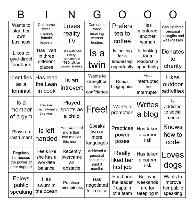This bingo card has a free space and 48 words: Really liked her first job, Is looking for a leadership opportunity, Has negotiated for a raise, Traveled internationally this year, Is an introvert, Is addicted to social media, Can name three inspiring female leaders, Has swum in the ocean, Has mentored another woman, Speaks two or more languages, Can list three personal strengths and weaknesses, Can name three inspiring women leaders, Has interrupted the interrupter, Reads biographies, Regularly harnesses the power of peer support, Writes a blog, Likes to give direct feedback, Donates to charity, Has taken a career risk, Prefers tea to coffee, Is looking for a leadership opportunity, Played sports as a child, Wants to start her own business, Has lived in three different places, Loves dogs, Has watched Sheryl Sandberg's TED talk on women leaders, Likes outdoor activities, Enjoys public speaking, Wants to strengthen her confidence, Has read the Lean In book, Believes weekends are for sleeping in, Wants a promotion, Knows how to code, Feels like she has a work/life balance, Is a member of a gym, Practices power poses, Has taken a career risk, Identifies as a feminist, Has watched more than two movies this month, Recently overcame an obstacle, Plays an instrument, Wants to improve her public speaking, Loves reality TV, Practices mindfulness, Is a twin, Achieved a personal goal in the past 3 months, Is left handed and Has been the leader / captain of a team.