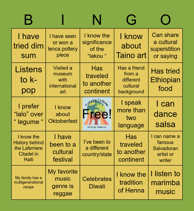 This bingo card has a free space and 34 words: Has traveled to another continent, I have been to the Grand Canyon, I can name a famous Dominican baseball player, I was born in a different country/state, I can dance salsa, Listens to k-pop, Visited a museum with international art, Celebrates Diwali, Has a friend from a different cultural background, I listen to marimba music, I prefer “lalo” over “ legume “, I have seen or won a lenca pottery piece, I know the tradition of Henna, I make or enjoy pasteles, I know the History behind the Laferriere Citadel in Haiti, I know about Oktoberfest, I’ve been to a different country/state, I speak more than two language, I can name a famous Salvadoran artist or writer, My family has a multigenerational recipe, My favorite music genre is reggae, I have seen or own Guatemalan textile, I know about Taino art, Has tried Ethiopian food, I listen to country music, I have been to a cultural festival, I know the significance of the “lakou “, I have visited Haiti, Can share a cultural superstition or saying, I have tried dim sum, Has traveled to another continent, Has traveled to another continent, Has traveled to another continent and Has traveled to another continent.