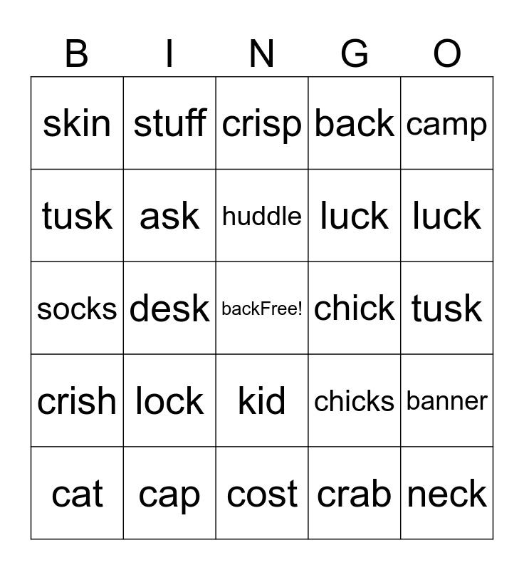 This bingo card has a free space and 29 words: cat, rock, desk, milk, skin, crisp, ask, lock, chick, cap, tusk, neck, cost, crab, luck, kit, kid, crish, camp, socks, chicks, scab, luck, tusk, back, stuff, banner, huddle and soccer.