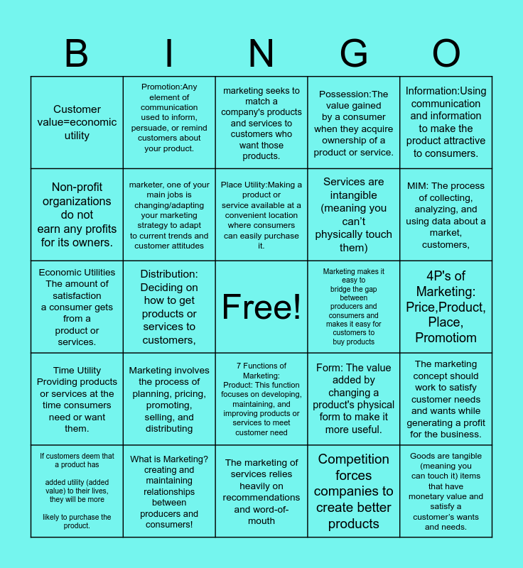 This bingo card has a free space and 24 words: Marketing involves the process of planning, pricing, promoting, selling, and distributing, What is Marketing?creating and maintaining relationships between producers and consumers!, Place Utility:Making a product or service available at a convenient location where consumers can easily purchase it., If customers deem that a product has added utility (added value) to their lives, they will be more likely to purchase the product., Information:Using communication and information to make the product attractive to consumers., Customer value=economic utility, Non-profit organizations do not earn any profits for its owners., Promotion:Any element of communication used to inform, persuade, or remind customers about your product., Marketing makes it easy to bridge the gap between producers and consumers and makes it easy for customers to buy products, 7 Functions of Marketing: Product: This function focuses on developing, maintaining, and improving products or services to meet customer need, Services are intangible (meaning you can’t physically touch them), Economic Utilities The amount of satisfaction a consumer gets from a product or services., Form: The value added by changing a product's physical form to make it more useful., The marketing concept should work to satisfy customer needs and wants while generating a profit for the business., marketer, one of your main jobs is changing/adapting your marketing strategy to adapt to current trends and customer attitudes, Competition forces companies to create better products, 4P's of Marketing: Price,Product, Place, Promotiom, marketing seeks to match a company's products and services to customers who want those products., MIM: The process of collecting, analyzing, and using data about a market, customers,, Distribution: Deciding on how to get products or services to customers,, Goods are tangible (meaning you can touch it) items that have monetary value and satisfy a customer’s wants and needs., Time Utility Providing products or services at the time consumers need or want them., Possession:The value gained by a consumer when they acquire ownership of a product or service. and The marketing of services relies heavily on recommendations and word-of-mouth.