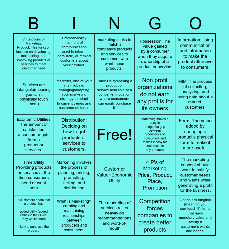 This bingo card has a free space and 24 words: Marketing involves the process of planning, pricing, promoting, selling, and distributing, What is Marketing?creating and maintaining relationships between producers and consumers!, Place Utility:Making a product or service available at a convenient location where consumers can easily purchase it., If customers deem that a product has added utility (added value) to their lives, they will be more likely to purchase the product., Information:Using communication and information to make the product attractive to consumers., 7 Functions of Marketing: Product: This function focuses on developing, maintaining, and improving products or services to meet customer need, Services are intangible(meaning you can't physically touch them), Promotion:Any element of communication used to inform, persuade, or remind customers about your product., Marketing makes it easy to bridge the gap between producers and consumers and makes it easy for customers to buy products, Customer Value=Economic Utility, Non profit organizations do not earn any profits for its owners, Economic Utilities The amount of satisfaction a consumer gets from a product or services., 4 P's of Marketing Price, Product, Place, Promotion, The marketing concept should work to satisfy customer needs and wants while generating a profit for the business., marketer, one of your main jobs is changing/adapting your marketing strategy to adapt to current trends and customer attitudes, Competition forces companies to create better products, Form: The value added by changing a product's physical form to make it more useful., marketing seeks to match a company's products and services to customers who want those products., MIM: The process of collecting, analyzing, and using data about a market, customers,, Distribution: Deciding on how to get products or services to customers,, Goods are tangible (meaning you can touch it) items that have monetary value and satisfy a customer’s wants and needs., Time Utility Providing products or services at the time consumers need or want them., Possession:The value gained by a consumer when they acquire ownership of a product or service. and The marketing of services relies heavily on recommendations and word-of-mouth.