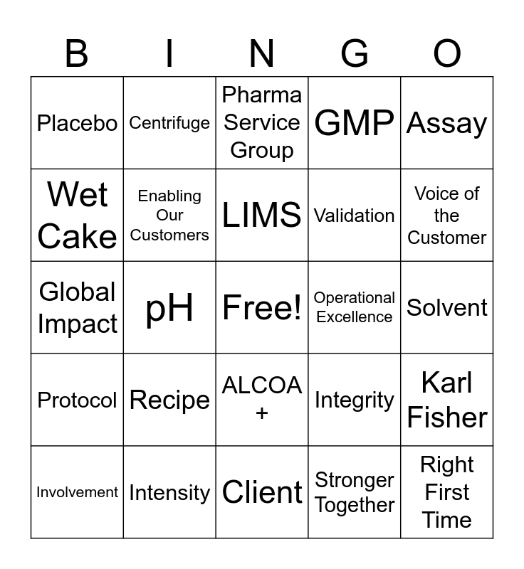 This bingo card has a free space and 66 words: MPU, Hot Work, Safe Work, Karl Fisher, HTF, Reactor, Centrifuge, Dryer, LIMS, Batch Record, ALCOA +, Boiling Point, Solvent, Assay, FIBC, Wet Cake, pH, Placebo, Disassembly, Validation, Recipe, Protocol, GMP, PPE, LOTO, Elevate, Service Excellence, Teamwork, Right First Time, Collaboration, Involvement, Innovation, Appreciation, Customer Centric, Integrity, Intensity, Continuous Improvement, Global Impact, Stronger Together, Celebrate Succes, Enabling Our Customers, Delivering Results, Operational Excellence, Quality, Compliance, Empowered, Voice of the Customer, Line of Sight, Buy-In, Circle Back, Harmonize, Due Diligence, Customer Experience, QSME, OJT, See Something Say Something, Production, Drug Substance, Pharma Service Group, Client, Target, Townhall, GEMBA, Commitment, eDMS and Smartsheet.