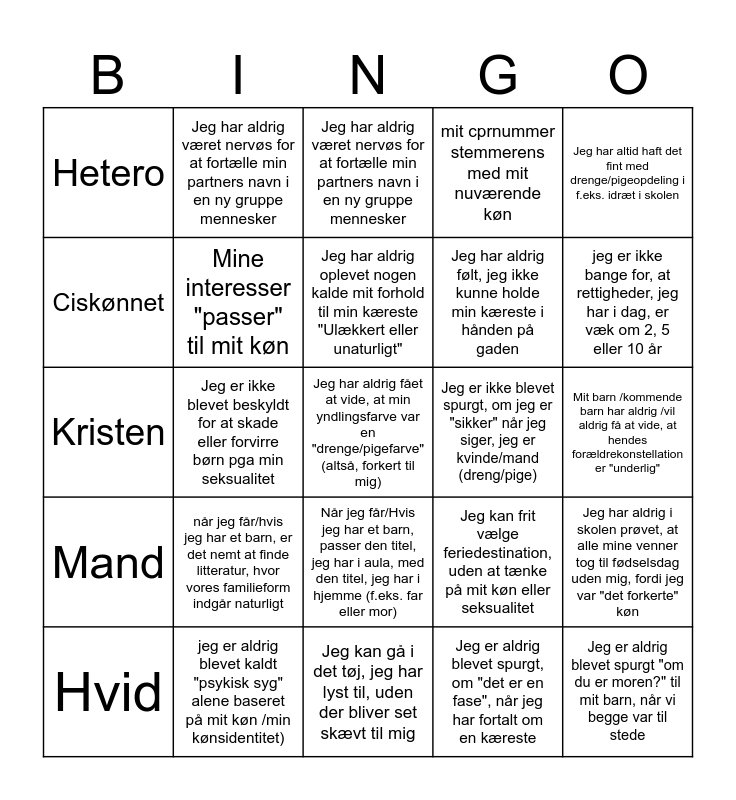 This bingo card has 25 words: Mand, jeg er aldrig blevet kaldt "psykisk syg" alene baseret på mit køn /min kønsidentitet), Jeg har aldrig fået at vide, at min yndlingsfarve var en "drenge/pigefarve" (altså, forkert til mig), Jeg er aldrig blevet spurgt, om "det er en fase", når jeg har fortalt om en kæreste, Jeg har altid haft det fint med drenge/pigeopdeling i f.eks. idræt i skolen, Hetero, Jeg har aldrig været nervøs for at fortælle min partners navn i en ny gruppe mennesker, Jeg har aldrig været nervøs for at fortælle min partners navn i en ny gruppe mennesker, Jeg er ikke blevet spurgt, om jeg er "sikker" når jeg siger, jeg er kvinde/mand (dreng/pige), Jeg har aldrig i skolen prøvet, at alle mine venner tog til fødselsdag uden mig, fordi jeg var "det forkerte" køn, Ciskønnet, Mine interesser "passer" til mit køn, Jeg kan gå i det tøj, jeg har lyst til, uden der bliver set skævt til mig, Jeg kan frit vælge feriedestination, uden at tænke på mit køn eller seksualitet, jeg er ikke bange for, at rettigheder, jeg har i dag, er væk om 2, 5 eller 10 år, Hvid, Jeg er ikke blevet beskyldt for at skade eller forvirre børn pga min seksualitet, Jeg har aldrig oplevet nogen kalde mit forhold til min kæreste "Ulækkert eller unaturligt", Jeg har aldrig følt, jeg ikke kunne holde min kæreste i hånden på gaden, Mit barn /kommende barn har aldrig /vil aldrig få at vide, at hendes forældrekonstellation er "underlig", Kristen, når jeg får/hvis jeg har et barn, er det nemt at finde litteratur, hvor vores familieform indgår naturligt, Når jeg får/Hvis jeg har et barn, passer den titel, jeg har i aula, med den titel, jeg har i hjemme (f.eks. far eller mor), mit cprnummer stemmerens med mit nuværende køn and Jeg er aldrig blevet spurgt "om du er moren?" til mit barn, når vi begge var til stede.