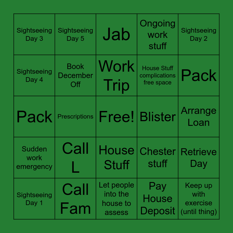 This bingo card has a free space and 24 words: Call L, Call Fam, Work Trip, Sightseeing Day 1, Sightseeing Day 2, Sightseeing Day 3, Sightseeing Day 4, Sightseeing Day 5, Blister, House Stuff, House Stuff complications free space, Pack, Chester stuff, Retrieve Day, Book December Off, Pay House Deposit, Arrange Loan, Jab, Pack, Prescriptions, Keep up with exercise (until thing), Sudden work emergency, Ongoing work stuff and Let people into the house to assess.