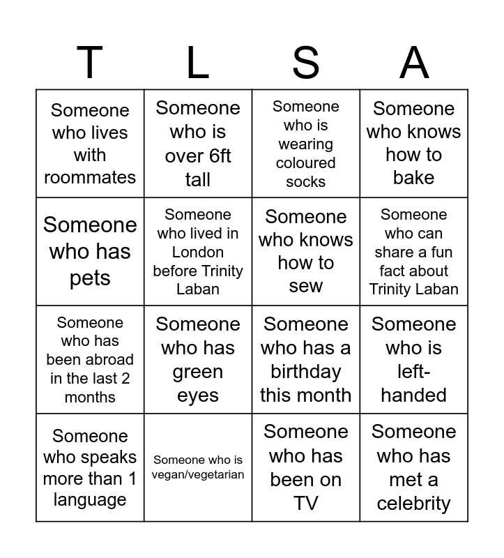 This bingo card has 16 words: Someone who speaks more than 1 language, Someone who is vegan/vegetarian, Someone who is wearing coloured socks, Someone who knows how to bake, Someone who has pets, Someone who is over 6ft tall, Someone who has a birthday this month, Someone who is left-handed, Someone who lives with roommates, Someone who lived in London before Trinity Laban, Someone who has been on TV, Someone who can share a fun fact about Trinity Laban, Someone who has been abroad in the last 2 months, Someone who has green eyes, Someone who knows how to sew and Someone who has met a celebrity.