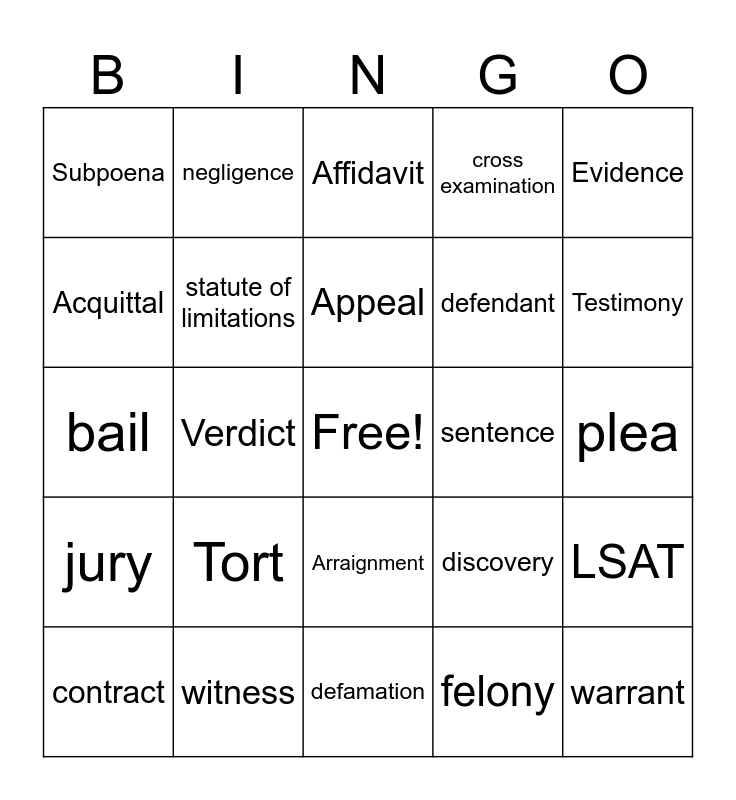 This bingo card has a free space and 24 words: Tort, witness, Appeal, contract, Evidence, Subpoena, Acquittal, negligence, sentence, Arraignment, defendant, bail, discovery, LSAT, statute of limitations, felony, plea, Affidavit, Testimony, Verdict, warrant, jury, cross examination and defamation.