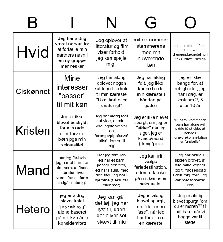 This bingo card has 25 words: Mand, jeg er aldrig blevet kaldt "psykisk syg" alene baseret på mit køn /min kønsidentitet), Jeg har aldrig fået at vide, at min yndlingsfarve var en "drenge/pigefarve" (altså, forkert til mig), Jeg er aldrig blevet spurgt, om "det er en fase", når jeg har fortalt om en kæreste, Jeg har altid haft det fint med drenge/pigeopdeling i f.eks. idræt i skolen, Hvid, Jeg har aldrig været nervøs for at fortælle min partners navn i en ny gruppe mennesker, Jeg oplever at litteratur og film viser forhold, jeg kan spejle mig i, Jeg er ikke blevet spurgt, om jeg er "sikker" når jeg siger, jeg er kvinde/mand (dreng/pige), Jeg har aldrig i skolen prøvet, at alle mine venner tog til fødselsdag uden mig, fordi jeg var "det forkerte" køn, Ciskønnet, Mine interesser "passer" til mit køn, Jeg kan gå i det tøj, jeg har lyst til, uden der bliver set skævt til mig, Jeg kan frit vælge feriedestination, uden at tænke på mit køn eller seksualitet, jeg er ikke bange for, at rettigheder, jeg har i dag, er væk om 2, 5 eller 10 år, Hetero, Jeg er ikke blevet beskyldt for at skade eller forvirre børn pga min seksualitet, Jeg har aldrig oplevet nogen kalde mit forhold til min kæreste "Ulækkert eller unaturligt", Jeg har aldrig følt, jeg ikke kunne holde min kæreste i hånden på gaden, Mit barn /kommende barn har aldrig /vil aldrig få at vide, at hendes forældrekonstellation er "underlig", Kristen, når jeg får/hvis jeg har et barn, er det nemt at finde litteratur, hvor vores familieform indgår naturligt, Når jeg får/Hvis jeg har et barn, passer den titel, jeg har i aula, med den titel, jeg har i hjemme (f.eks. far eller mor), mit cprnummer stemmerens med mit nuværende køn and Jeg er aldrig blevet spurgt "om du er moren?" til mit barn, når vi begge var til stede.