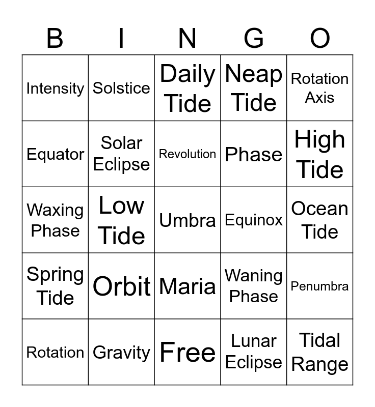 This bingo card has a free space and 24 words: Orbit, Gravity, Revolution, Rotation, Rotation Axis, Intensity, Equator, Solstice, Equinox, Maria, Phase, Waxing Phase, Waning Phase, Penumbra, Solar Eclipse, Lunar Eclipse, Ocean Tide, Daily Tide, High Tide, Low Tide, Tidal Range, Spring Tide, Neap Tide and Free.