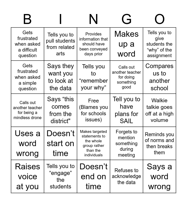 This bingo card has a free space and 24 words: Doesn’t start on time, Tells you to “engage” the students, Tells you to “remember your why”, Raises voice at you, Tells you to give students the “why” of the assignment, Gets frustrated when asked a difficult question, Gets frustrated when asked a simple question, Tells you to pull students from related arts, Tell you to have plans for SAIL, Makes targeted statements to the whole group rather than the individuals, Calls out another teacher for doing something good, Calls out another teacher for being a mindless drone, Forgets to mention something during meeting, Reminds you of norms and then breaks them, Says they want you to look at the data, Refuses to acknowledge the data, Walkie talkie goes off at a high volume, Provides information that should have been conveyed days prior, Compares us to another school, Says “this comes from the district", Says a word wrong, Uses a word wrong, Makes up a word and Doesn’t end on time.