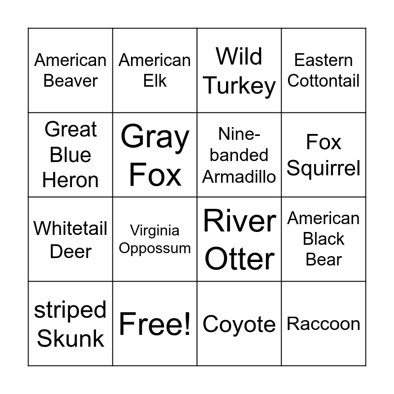 This bingo card has 16 words: Free!, American Black Bear, Wild Turkey, American Beaver, Whitetail Deer, American Elk, River Otter, Coyote, Great Blue Heron, Gray Fox, striped Skunk, Eastern Cottontail, Virginia Oppossum, Fox Squirrel, Nine-banded Armadillo and Raccoon.