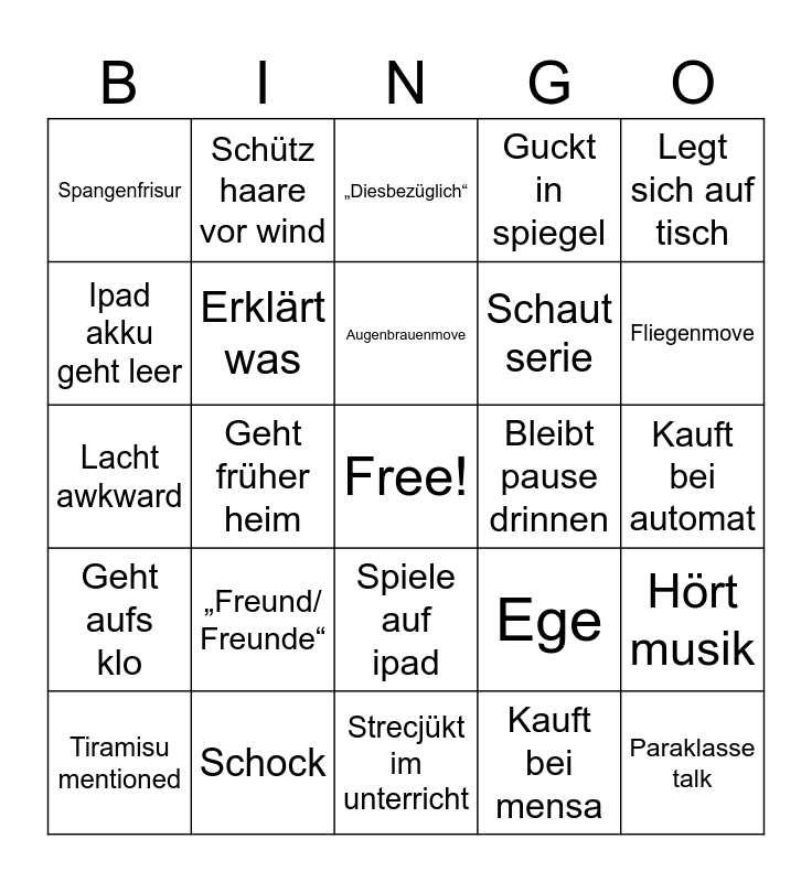 This bingo card has a free space and 24 words: „Freund/ Freunde“, Schock, Augenbrauenmove, Tiramisu mentioned, Legt sich auf tisch, Spangenfrisur, Ipad akku geht leer, Schütz haare vor wind, Bleibt pause drinnen, Spiele auf ipad, Schaut serie, Lacht awkward, Ege, Hört musik, Erklärt was, Kauft bei mensa, Kauft bei automat, „Diesbezüglich“, Fliegenmove, Geht früher heim, Paraklasse talk, Geht aufs klo, Guckt in spiegel and Strecjükt im unterricht.