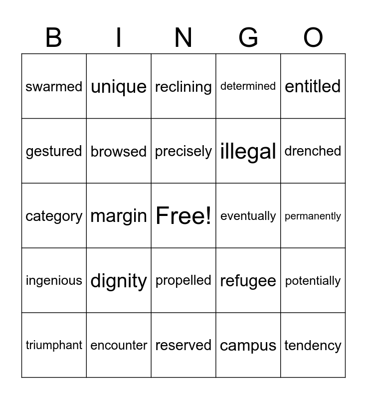 This bingo card has a free space and 34 words: stationary, campus, condition, selfless, ingenious, browsed, entitled, triumphant, unique, vividly, precisely, reclining, receptive, accomplish, eventually, drenched, encounter, category, dignity, refugee, propelled, glimpse, swarmed, permanently, reserved, tendency, determined, volunteer, illegal, gestured, rotate, margin, potentially and impressed.